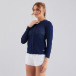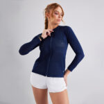 Jaqueta feminina manga longa com detalhe de bolsos laterais e fechamento frontal com zipper. Sua modelagem permite conforto e ajuste anatômico ao corpo, tecido leve e funcional adequado a diversas práticas esportivas.